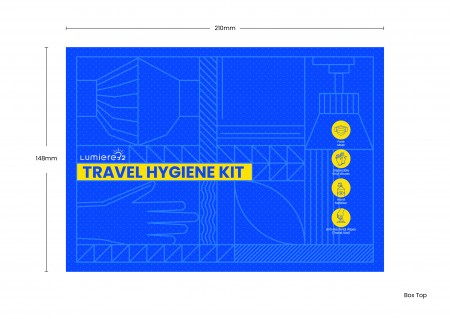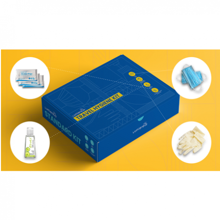 Travel Hygiene Kit- it includes 2 x surgical Face mask with ear loop 1 x Hand sanitizer liquid 70% alcohol 30ml x 1 1 pair disposable Vinyl gloves dark blue size large 5pc anti-bacterial wipes (travel size) Box material : soft cardboard